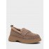 Женские демисезонные лоферы серого цвета выполнены из натурального спилка с мягкой замшевой текстурой. Внутренняя часть дополнена подкладкой из искусственного меха, а край модели аккуратно отделан мехом, что создаёт ощущение тепла и визуально смягчает силуэт. Спокойный серый оттенок подчёркивает фактуру материала и делает модель универсальной в сочетаниях.